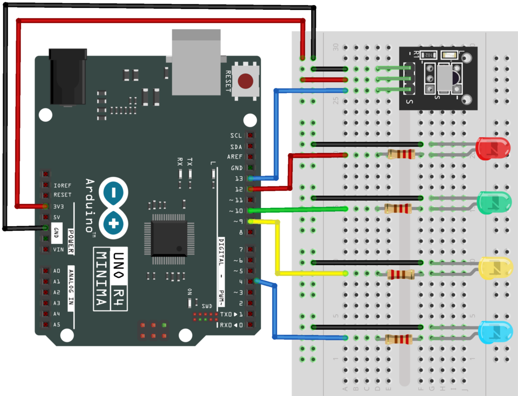 Dans ce projet, l’objectif est de contrôler l’allumage de plusieurs LEDs à l’aide d’une télécommande infrarouge. Les commandes envoyées par la télécommande sont reçues par un capteur infrarouge connecté à la carte Arduino, puis décodées afin d’identifier les actions à effectuer. En fonction des boutons pressés, l’Arduino active ou désactive les LEDs correspondantes.