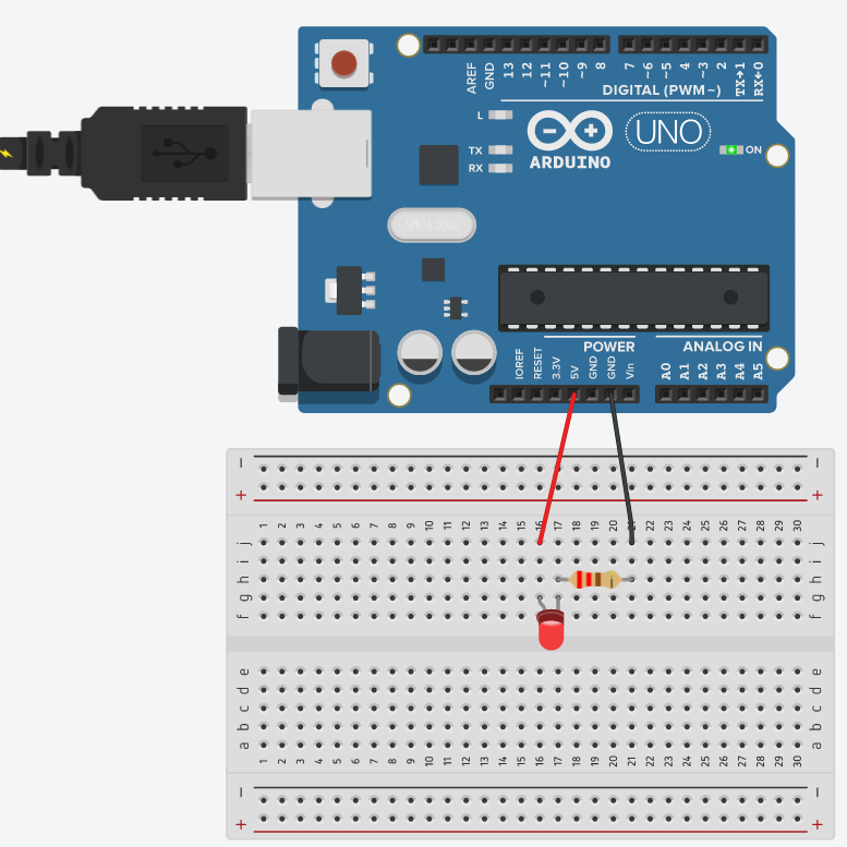 A l’inverse, la cathode qui est la patte droite ou la plus courte se branche sur le GND de votre carte Arduino.