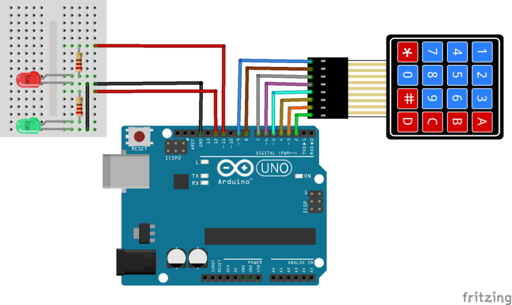 La led rouge est d’abord allumée. Puis en tapant le code 0123 puis D pour confirmer le code, la led verte va s’allumer. Si le code est mauvais et que vous appuyer sur D; la led rouge va clignoter.
