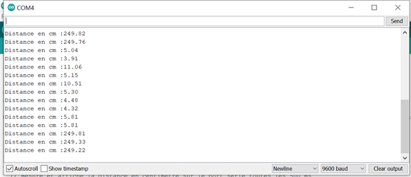 Serial.print("Distance en cm :"); // Permet d'afficher sur le moniteur série sur la même ligne