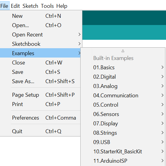 Sur Arduino IDE, vous avez des codes déjà pré-fait. Ils peuvent vous être utile pour voir comment un composant fonctionnne et pour le tester rapidement.  On va retrouver ces codes dans fichier puis examples.