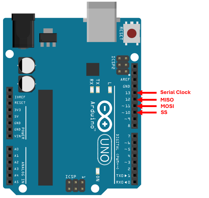Sur les cartes Arduino, les broches dédiées au SPI varient en fonction du modèle de la carte. Par exemple, sur une Arduino Uno, les broches SPI sont :