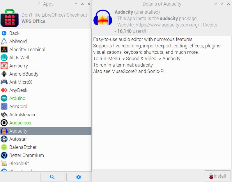 Pour installer Audacity sur la Raspberry Pi, nous allons utiliser un gestionnaire d’application appelé “Pi-app” et qui va vous permettre d’installer tout type de logiciel sur votre carte. Vous pouvez le télécharger avec le lien suivant :