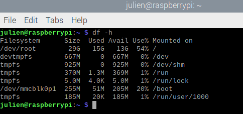 En redémarrant notre Raspberry pi, en retapant la commande Df -h, on peut voir notre partiton étendu :