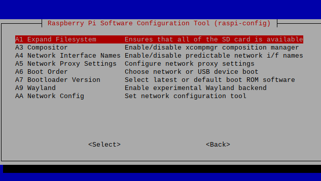 On va maintenant utiliser le menu de configuration de Raspberry Pi, appelé Rasp-config pour étendre notre partition. Pour cela vous devez taper la commande suivante :