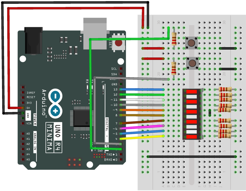 Introduction Ce projet consiste à réaliser un bargraphe à LED commandé par une carte Arduino et deux boutons poussoirs. L’objectif est de contrôler l’allumage progressif des LED du bargraphe à l’aide de boutons, l’un permettant d’ajouter une LED allumée et l’autre d’en retirer une. Le système est composé d’une carte Arduino, d’un bargraphe à LED (ou plusieurs LED individuelles), de résistances pour protéger les LED, et de deux boutons poussoirs. Chaque bouton est connecté à une entrée numérique de la carte Arduino, tandis que les LED du bargraphe sont reliées aux sorties numériques. Le fonctionnement est simple : lorsqu’on appuie sur le premier bouton, le programme incrémente un compteur et allume une LED supplémentaire sur le bargraphe. À chaque appui, le nombre de LED allumées augmente progressivement, jusqu’à atteindre le maximum disponible. Le second bouton permet de décrémenter ce compteur et d’éteindre une LED à chaque appui, jusqu’à ce que toutes les LED soient éteintes. Schéma du circuit Programme du circuit const int btn_minus = 2; //Bouton 1 pour décrémenter le nombre de LEDs allumés const int btn_plus = 3; //Bouton 2 pour incrémenter le nombre de LEDs allumés const int led_0 = 4; //Led 0 const int led_1 = 5; //Led 1 const int led_2 = 6; //Led 2 const int led_3 = 7; //Led 3 const int led_4 = 8; //Led 4 const int led_5 = 9; //Led 5 const int led_6 = 10; //Led 6 const int led_7 = 11; //Led 7 const int led_8 = 12; //Led 8 const int led_9 = 13; //Led 9 /* Déclaration des variables utilisées pour le comptage et le décomptage */ int nombre_led = 0; //le nombre qui sera incrémenté et décrémenté int etat_bouton; //lecture de l'état des boutons (un seul à la fois, mais une variable suffit; en effet, il n'est pas prévu d'appuyer sur les deux boutons simultanément) int memoire_plus = LOW; //état relâché par défaut pour le bouton 2 int memoire_minus = LOW; //état relâché par défaut pour le bouton 1 /* Initialisation des broches en entrée/sortie: entrées pour les boutons, sorties pour les LEDs */ void setup() { pinMode(btn_plus, INPUT); pinMode(btn_minus, INPUT); pinMode(led_0, OUTPUT); pinMode(led_1, OUTPUT); pinMode(led_2, OUTPUT); pinMode(led_3, OUTPUT); pinMode(led_4, OUTPUT); pinMode(led_5, OUTPUT); pinMode(led_6, OUTPUT); pinMode(led_7, OUTPUT); pinMode(led_8, OUTPUT); pinMode(led_9, OUTPUT); } void loop() { etat_bouton = digitalRead(btn_plus); //Si le bouton a un état différent que celui enregistré ET que cet état est "appuyé" if ((etat_bouton != memoire_plus) && (etat_bouton == HIGH)) { nombre_led++; //on incrémente la variable qui indique combien de LEDs devrons s'allumer } memoire_plus = etat_bouton; //on enregistre l'état du bouton pour le tour suivant etat_bouton = digitalRead(btn_minus); //lecture de son état if ((etat_bouton != memoire_minus) && (etat_bouton == HIGH)) { nombre_led--; //on décrémente la valeur de nombre_led } memoire_minus = etat_bouton; //on enregistre l'état du bouton pour le tour suivant //on applique des limites au nombre pour ne pas dépasser 4 ou 0 (puisqu'on a 4 LEDs) if (nombre_led > 10) { nombre_led = 10; } if (nombre_led < 0) { nombre_led = 0; } affiche(nombre_led); } void affiche(int valeur_recue) { //on éteint toutes les leds digitalWrite(led_0, LOW); digitalWrite(led_1, LOW); digitalWrite(led_2, LOW); digitalWrite(led_3, LOW); digitalWrite(led_4, LOW); digitalWrite(led_5, LOW); digitalWrite(led_6, LOW); digitalWrite(led_7, LOW); digitalWrite(led_8, LOW); digitalWrite(led_9, LOW); //Puis on les allume une à une if (valeur_recue >= 1) { digitalWrite(led_0, HIGH); // "on allume la LED 0 } if (valeur_recue >= 2) { digitalWrite(led_1, HIGH); // "on allume la LED 1 (sous-entendu que la LED 0 est allumée, puisque la valeur est plus grande que 1) } if (valeur_recue >= 3) { digitalWrite(led_2, HIGH); // "on allume la LED 2 } if (valeur_recue >= 4) { digitalWrite(led_3, HIGH); // "on allume la LED 3 } if (valeur_recue >= 5) { digitalWrite(led_4, HIGH); // "on allume la LED 3 } if (valeur_recue >= 6) { digitalWrite(led_5, HIGH); // "on allume la LED 3 } if (valeur_recue >= 7) { digitalWrite(led_6, HIGH); // "on allume la LED 3 } if (valeur_recue >= 8) { digitalWrite(led_7, HIGH); // "on allume la LED 3 } if (valeur_recue >= 9) { digitalWrite(led_8, HIGH); // "on allume la LED 3 } if (valeur_recue >= 10) { digitalWrite(led_9, HIGH); // "on allume la LED 3 } } Ce bargraphe peut être utilisé pour représenter un niveau, comme un volume sonore, une charge de batterie ou une intensité lumineuse. Il constitue une excellente introduction à la programmation embarquée et à l’interaction homme-machine.