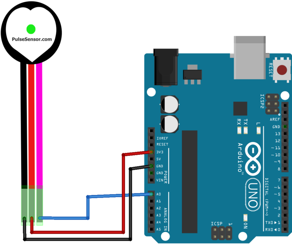 Voici le schéma électronique pour relier le capteur cardiaque à la carte Arduino Uno :
