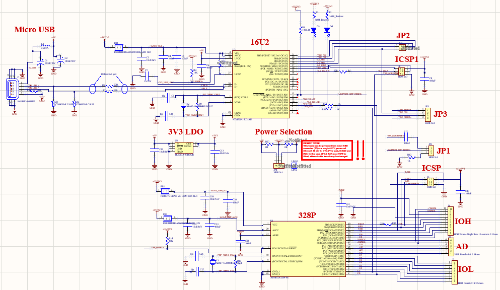 Pour programmer l’Atmega328P, nous l’avons relié un micro-USB et un microcontrôleur Atmega 16U2. Ceci permet programme directement notre carte depuis Arduino ide par usb.