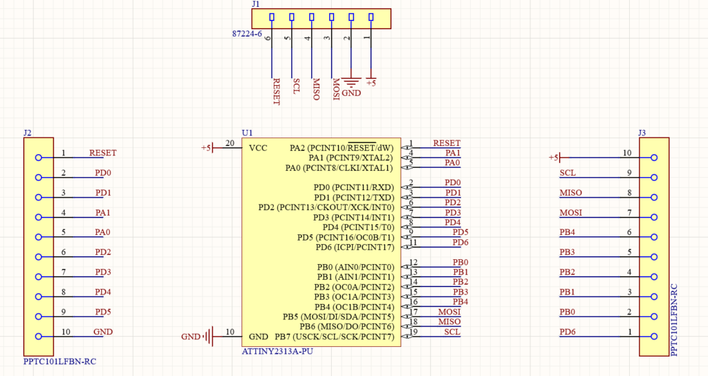 Dans notre carte PCB nous avons ajouté des connecteurs femelles afin d’utiliser l’ATtiny dans plein de configurations différentes et un connecteur mâle afin de programmer l’ATtiny. L’ATiny choisit est le 2313A-PU. C’est une puce traversante qui possède 20 pins avec du SPI, de l’I2C et de l’UART :
