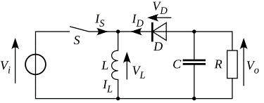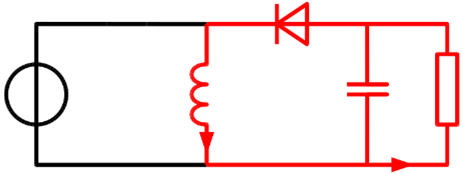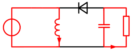Diode (D) : Lorsque l’interrupteur est en position OFF, il permet au courant de circuler dans une seule direction, de l’inducteur vers la sortie. Le condensateur de sortie ne peut pas se décharger vers la source d’entrée grâce à la diode.