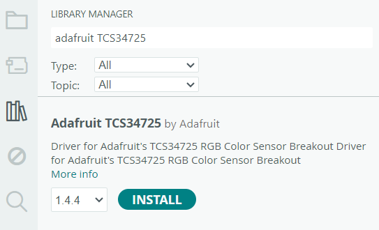 Pour ce projet, il est nécessaire d’installer la librairie Adafruit TCS34725, qui permet de communiquer avec le capteur de couleur TCS34725 et de récupérer ses différentes valeurs de mesure.