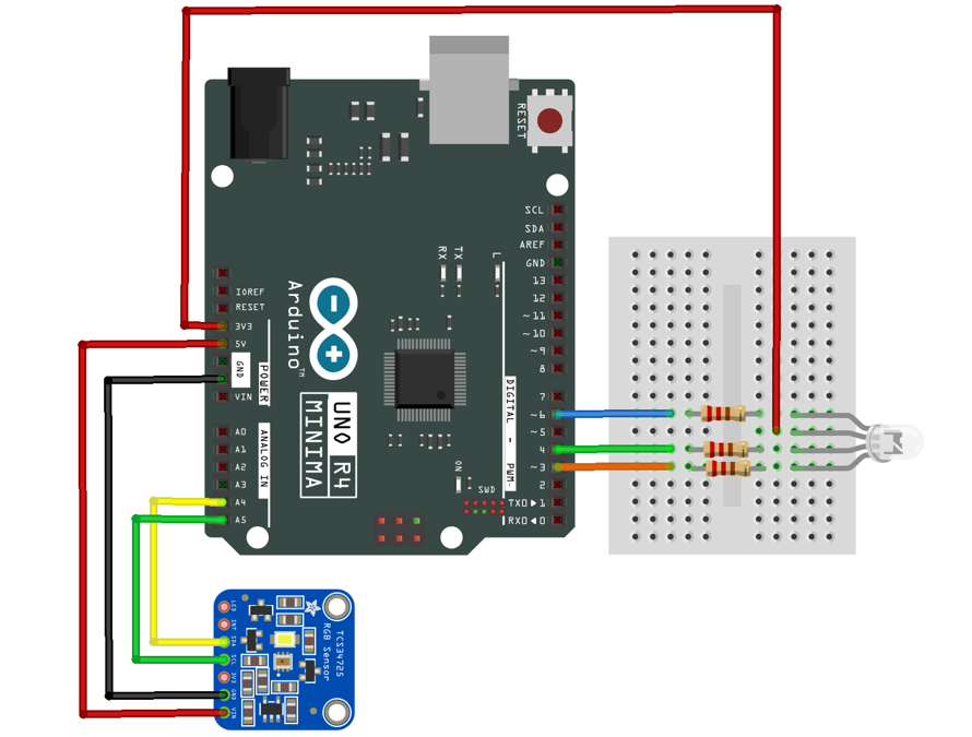 L’Arduino analyse ensuite les valeurs reçues et détermine la couleur dominante de l’objet observé. En fonction de ce résultat, il commande une LED RGB externe qui s’allume avec la même couleur que celle détectée par le capteur. Cette LED permet ainsi de visualiser instantanément et de manière intuitive la couleur lue par le TCS3472.