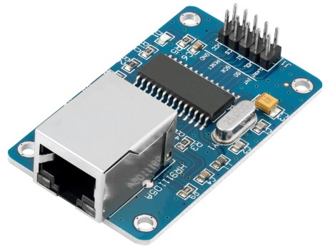 À droite, on trouve un module Ethernet ENC28J60. Ce module peut offrir certaines améliorations par rapport au shield classique, mais il présente quelques contraintes : il ne permet pas de connecter directement une carte SD pour le stockage, et il ne se branche pas directement sur l’Arduino. Il nécessite l’utilisation de cordons de connexion pour relier ses broches à la carte Arduino.
