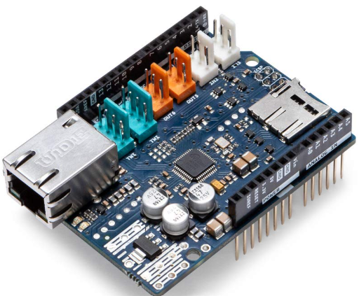 Sur l’image à gauche, on voit un shield Ethernet équipé également d’un socle pour carte microSD. Cela permet de stocker temporairement des données, bien que ce ne soit pas l’objectif principal ici.