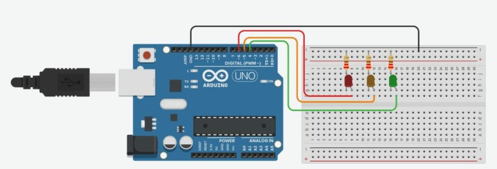 Dans ce projet on va voir comment faire un feu tricolore de circulation. C’est un projet assez simple à faire mais qui permet de mieux comprendre comment faire fonctionner des leds chacune à leurs tours, comment gérer les pauses pour voir les leds s’allumer… Difficulté : Matériel nécessaire On va maintenant le matériel nécessaire pour le projet :Une carte Arduino Uno3 leds (rouge, orange, vert)3 résistances 220 ohmsUne breadboard 4 Fils de liaisons Schéma du projet A quoi sert les résistances ? Les résistances permettent de limiter le courant dans vos leds et donc de ne pas les griller. Programme du projet /* Code pour le feu tricolore Arduino Factory */ int led_Rouge = 6; // On assigne la LED Rouge à la broche 6 int led_Orange = 5; // On assigne la LED Orange à la broche 5 int led_Verte = 4; // On assigne la LED Verte à la broche 4 void setup() { // On met toute les leds en sortie pinMode(led_Rouge, OUTPUT); pinMode(led_Orange, OUTPUT); pinMode(led_Verte, OUTPUT); } void loop() { // Feu vert digitalWrite(led_Verte,LOW); digitalWrite(led_Rouge,HIGH); // Feu orange delay(2000); // On fait une pause pour voir la led verte allumée digitalWrite(led_Rouge,LOW); digitalWrite(led_Orange,HIGH); // On éteint la LED delay(700); // On fait une pause pour voir la led orange allumée (temps plus court que la led rouge et verte) // Feu Rouge allumé digitalWrite(led_Orange,LOW); digitalWrite(led_Verte,HIGH); delay(2000); // On fait une pause pour voir la led rouge allumée } Comment mettre le programme sur la carte Arduino ? Pour mettre le programme sur la carte Arduino uno, vous avez besoin du logiciel Arduino Ide. Il vous suffit ensuite de connecter votre carte Arduino, puis de choisir le bon port. Enfin vous pourrez mettre le programme sur la carte. Simulation Voici une simulation du projet sur tinkercad : Conclusion Pour finir le projet, il vous reste qu’a souder les fils pour enlever la breadboard et d’utiliser du carton pour faire tenir les trois leds afin d’avoir un feu tricolore fonctionnel.