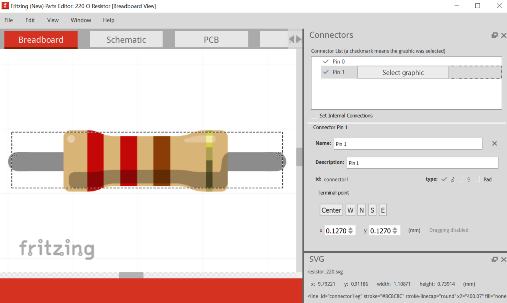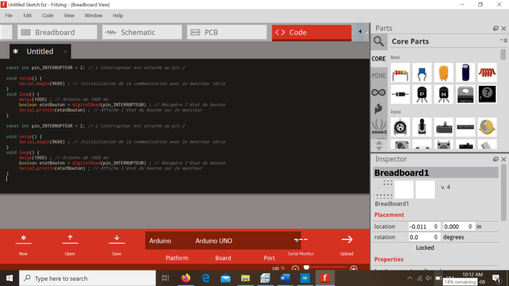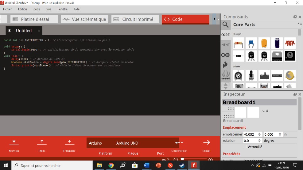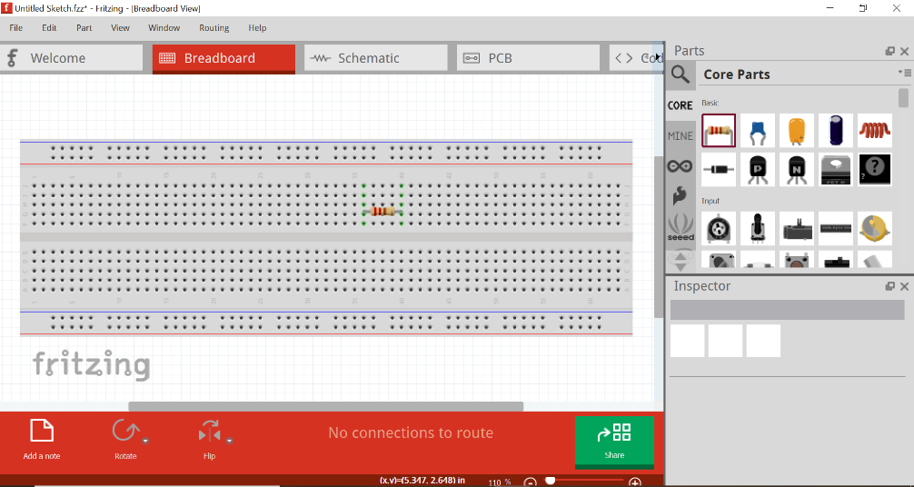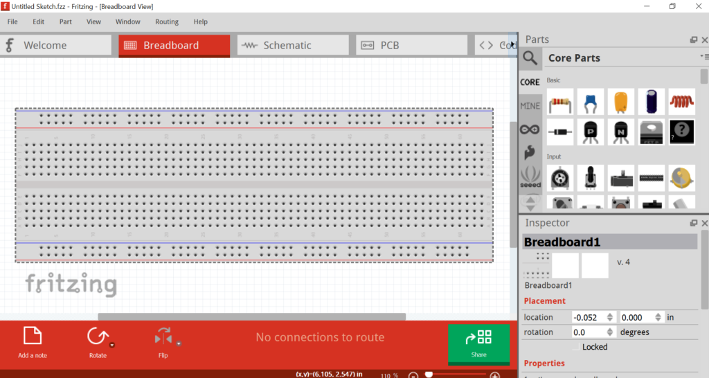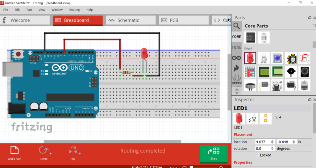 Enfin il nous faudra une résistance que l’on peut trouver sur Fritzing dans la partie Core : vous devez cliquer sur le composant et le glisser/déposer autour de la breadboard