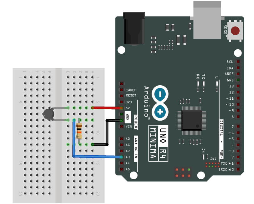 Introduction L’objectif de ce projet est de mesurer la température ambiante à l’aide d’une thermistance connectée à une carte Arduino.Une thermistance est une résistance dont la valeur électrique varie en fonction de la température. Composants nécessaires 1 Arduino Uno1 planche de prototypage1 capteur de température (thermistance)1 résistance 10kΩ 3 fils Programme du circuit void setup() { Serial.begin(9600); } void loop() { float AnalogT; float AnalogTf; AnalogT = float(analogRead(A3)); AnalogTf = (-40000 / AnalogT) + 100; Serial.println(); Serial.print("Temperature: "); Serial.print(AnalogTf); Serial.print("C"); delay(1000); } Initialise la communication série à 9600 bauds.Dans la boucle principale :Lit la valeur analogique de la thermistance sur A5.Calcule la température approximative avec une formule simple.Affiche la température sur le moniteur série.Attend 1 seconde et recommence.💡 Remarque importante :La formule (-40000 / AnalogT) + 100 est très approximative et ne fonctionne que pour une thermistance spécifique et un certain montage.Pour des mesures précises, il vaut mieux utiliser un diviseur de tension calibré et appliquer la loi Steinhart-Hart.