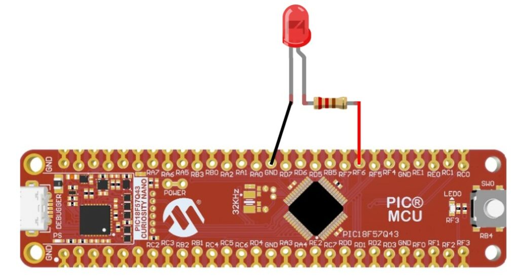 Dans le cours sur MPLAB on a vu comment allumer la led interne de la carte Microchip.  Ici on va voir comment allumer une led externe sur la carte Microchip.