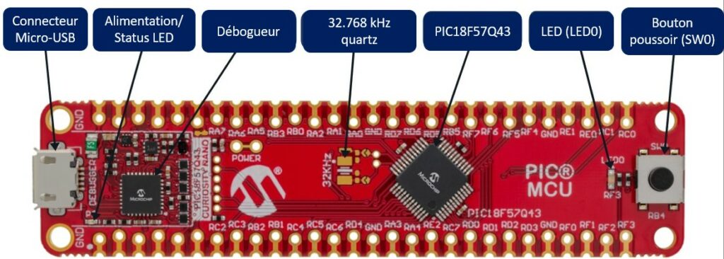 • PIC18F57Q43 : Microprocesseur de la carte qui permet d’éxécuter votre programme.