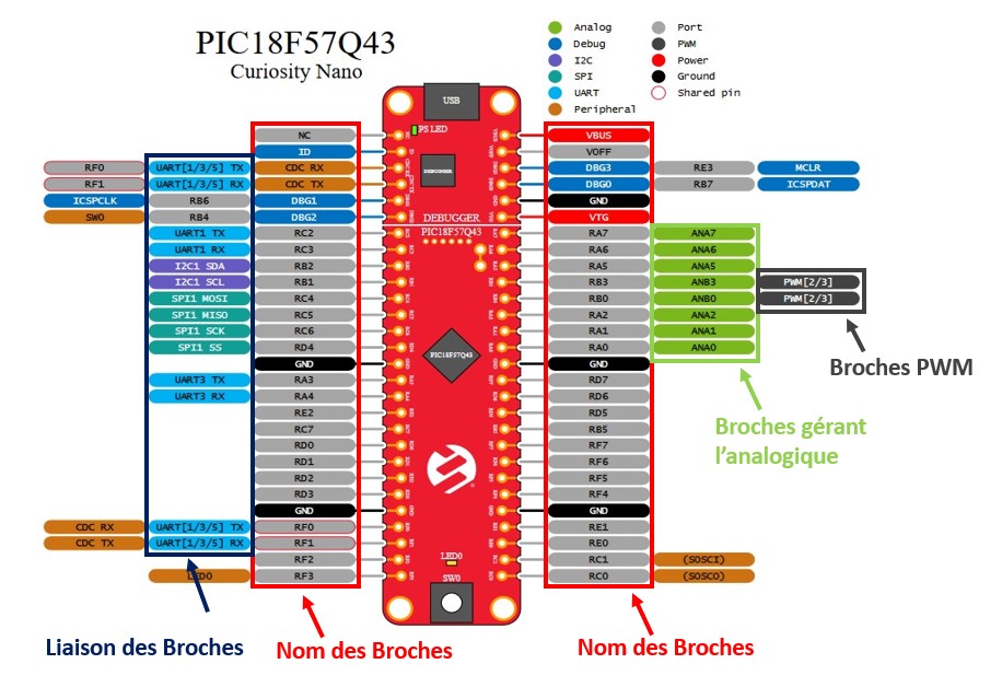 Comme vous pouvez voir, il y a beaucoup de broches sur une carte Microchip curiosity nano kit. Certaine ont en plus des spécificités comme une liaison UART ou support l’analogique ou le pwm. C’est pour cela que l’on a séparé l’image en catégorie :