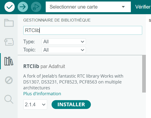 Pour utiliser le moduel d’horloge DS1307, vous allez avoir besoin d’installer la librairie RTClib dans Arduino IDE. Pour cela cliquer sur Gestionnaire de bibliothèque puis RTClib :