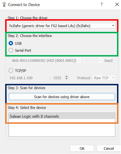 • Dans le carré rouge :  Vous devez choisir un des drivers disponible par rapport à votre analyseur. Si vous avez acheté celui que l’on vous a proposé plus tôt c’est le fx2lafw.