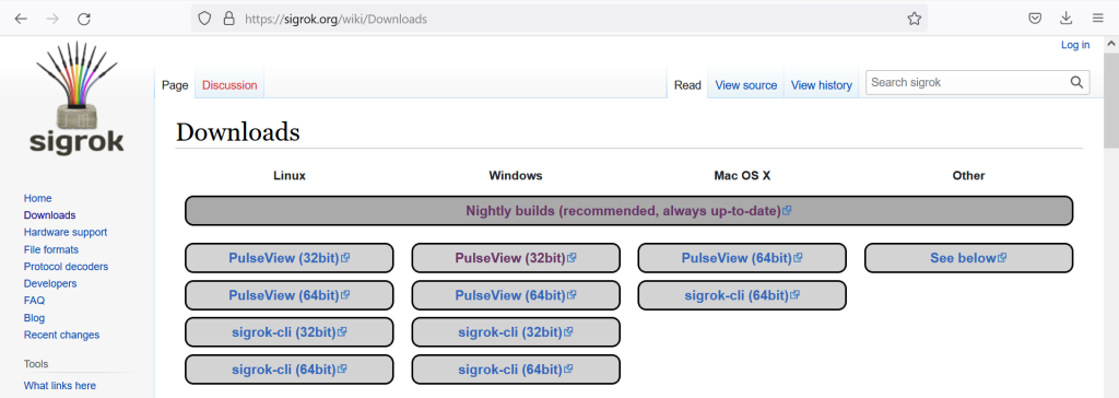 Pour l’utiliser, on a besoin de télécharger le logiciel PulseView, qui va permettre de recevoir le signal. Vous pouvez le télécharger sur ce site.  en choisissant pulseview 32 ou 64 bits. Le logiciel existe aussi sur mac et linux :