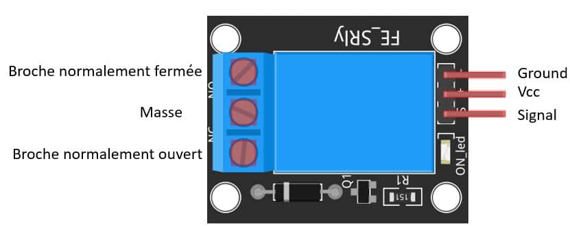 Dans cette configuration, si la broche est à l’état bas le relais est fermé, c’est à dire que votre composant sera allumé.