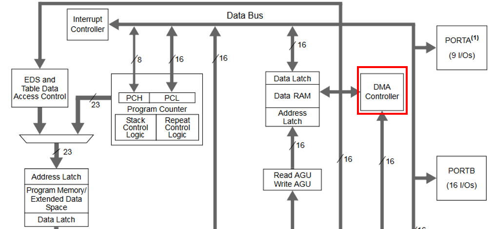La DMA a seulement accès à une partie de la Ram. En effet, la partie de la Ram accessible par la DMA doit être aussi accessible au microcontrôleur s’il a besoin de la même variable au même moment . Pour que les deux puissent accéder à la même case mémoire en même temps, il faut que celle-ci soit double port. En pratique, c’est très rare que la même case mémoire soit accedé en même temps. On remarque que c’est une DMA 16 channels : elle peut créer 16 transfert de données en même temps.