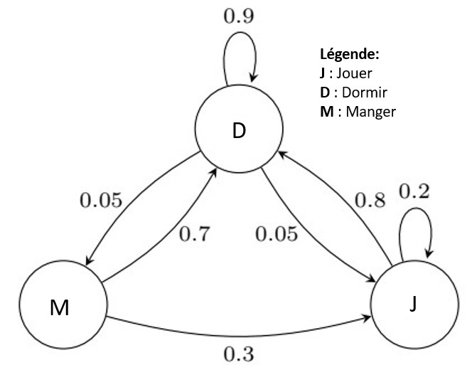 3. Quand il se réveille, il y a 1 chance sur 2 qu’il joue et 1 chance sur 2 qu’il mange : On ajoute donc deux flèches partant de dormir vers Manger et vers jouer qui valent 0.05 car comme il y a 9/10 chance qu’il dorme, il reste donc 1/10 pour qu’il fasse autre chose. Il y a 50% de chance qu’il mange ou joue donc ca fait (1/10) /2 donc 0.05 qu’il joue ou mange.