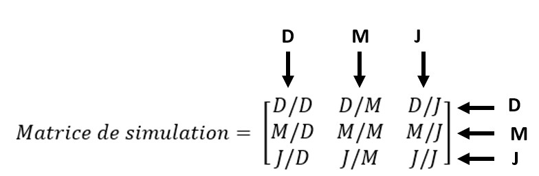 Pour remplir notre matrice, on va utiliser les probabilités de dormir, manger et jouer de Bob se situant sur le shéma de Markov. On va voir comment remplir la matrice à droite. (D = dormir, M= manger, J =jouer).