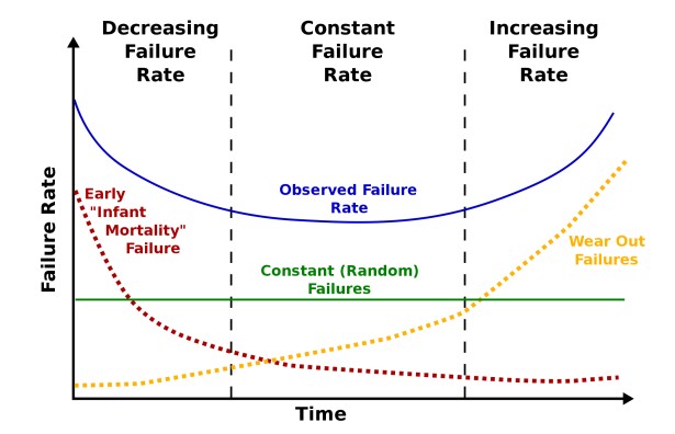 La première partie montre un taux de défaillance décroissant, appelé défaillance précoce ; la seconde partie est un taux de défaillance constant, dit de défaillance aléatoire ; et la troisième partie est un taux de défaillance croissant, qui est la défaillance par usure.