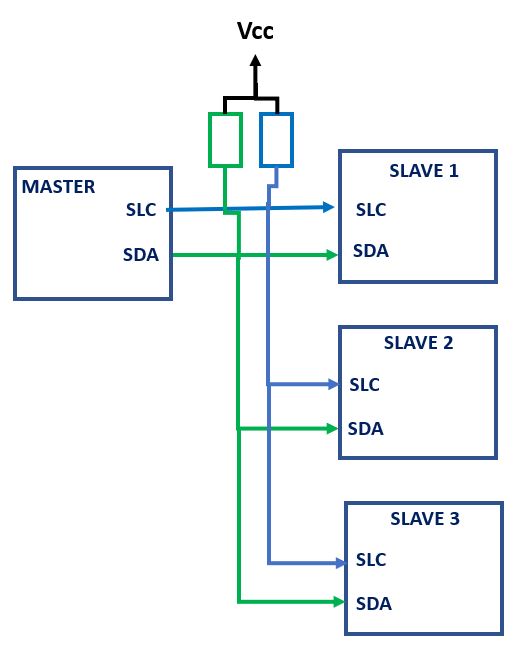 Enfin comme on peut voir sur le schéma ci-dessous que la liaison I2C n’est pas exclusive, cela veut dire qu’un maitre peut parler à plusieurs esclave.