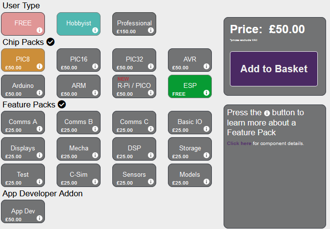 La version payante de Flowcode permet d’utiliser le logiciel sans contrainte de temps et d’avoir en plus des librairies contenant la carte Arduino et la Raspberry Pi. Chaque librairie de composant s’achète en plus. Voici le lien pour acheter Flowcode : https://www.flowcode.co.uk/buy/process/