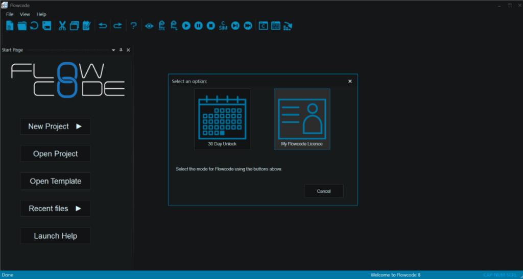 Une fois l’installation terminée on se retrouve sur le logiciel de Flowcode où l’on va devoir activer notre licence utilisateur :