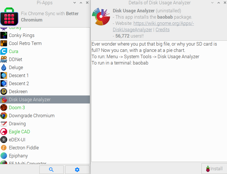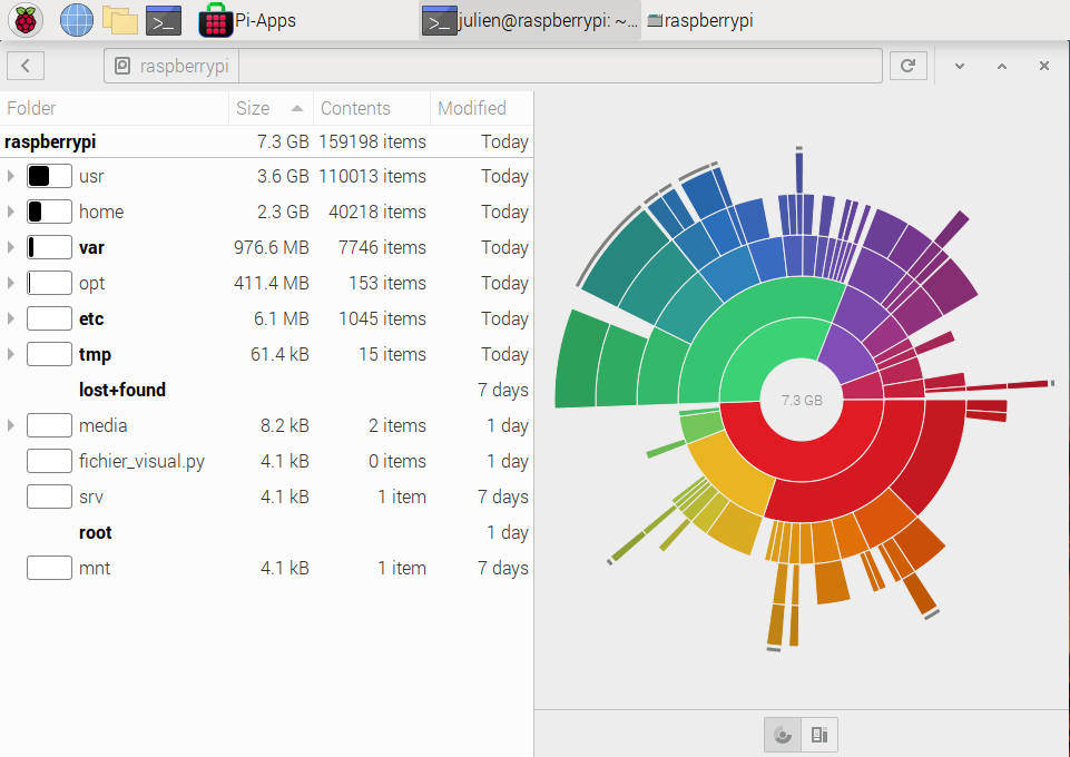 Disk Usage Analyzer (ou Baobab) est un utilitaire graphique puissant qui permet d’analyser l’utilisation de l’espace disque sur un Raspberry Pi. Cet outil offre une vue d’ensemble détaillée de la façon dont l’espace de stockage est réparti sur les différents disques et partitions, ce qui permet de localiser rapidement les dossiers ou fichiers qui occupent le plus d’espace.