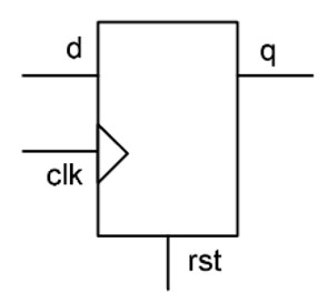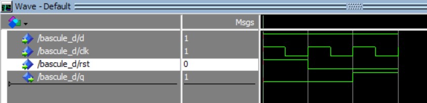 On a besoin d’une horloge (clk) car c’est une bascule synchrone. Enfin la fonction reset de faire passer les données de d vers q ou bien de réinitialiser la bascule.