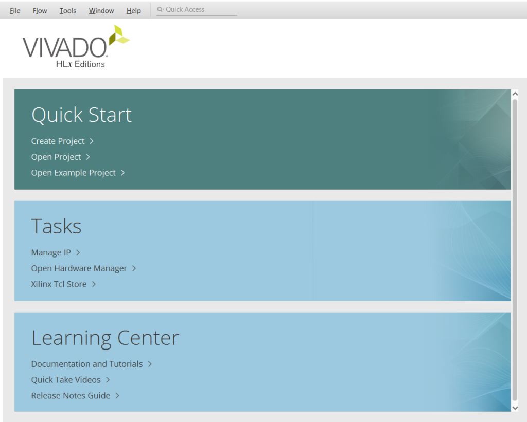 On ouvre le logiciel Vivado et on va cliquer sur open project pour aller chercher le projet PC Cam :