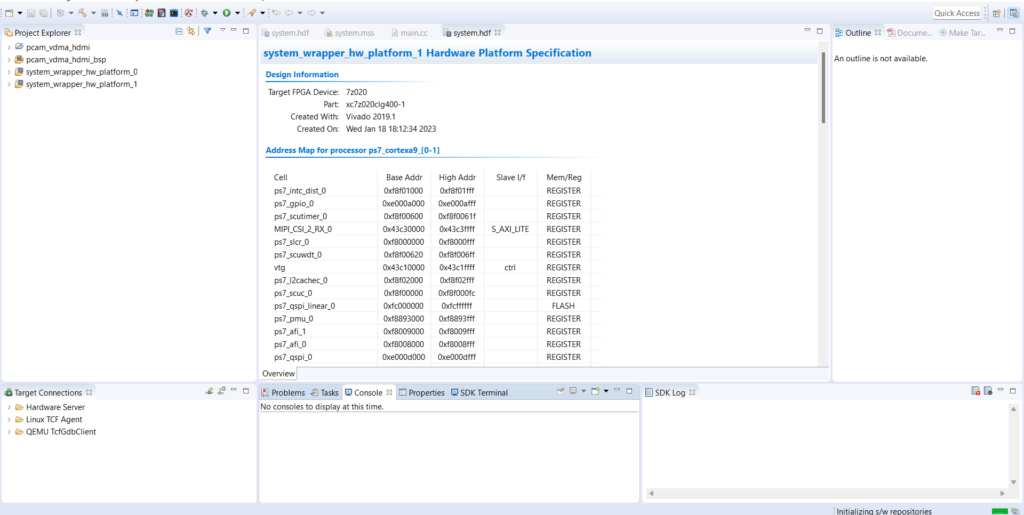 La deuxième partie de ce projet se fait sur Eclipse. On peut déjà voir que notre projet PC Cam est apparue dans le logiciel appelé par pcam_vdma_hmdi :