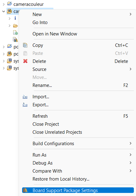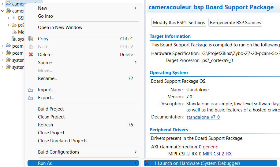 Une fois la carte FPGA programmée, on peut lancer son exécution sur Eclipse afiin de voir l’image sur votre écran en HDMI. Pour cela vous devez faire clique droit sur votre projet puis Run As et Lauch on Hadware (System Debugger) :