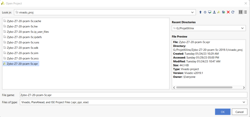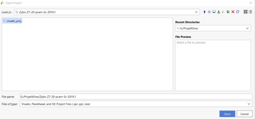 Dans le dossier vivado_proj on va choisir le fichier Zybo-27-20-pcam-5C.xpr :