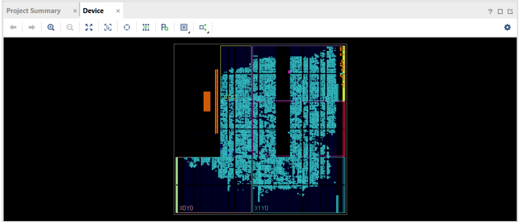 Une fois l’implementation complété, vous pouvez cliquer sur Open Implemented Design  pour voir comment le programme sera implémenté sur la carte et son pourcentage d’occupation dans la mémoire :